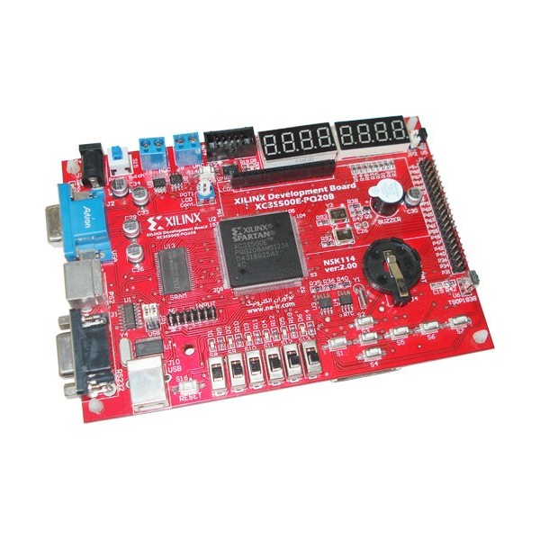 تراشه Xilinx Spartan3 Series FPGA XC3S500E-PQG208 : این تراشه دارای مشخصات و قابلیت های بی شماری می باشد. این تراشه با دارا بودن 208 پایه توانایی بسیار بالایی در انجام کارها دارد. جهت مشاهده اطلاعات کامل تری از این تراشه دیتاشیت آن را مطالعه نمایید. حافظه XCF04S : این آی سی برای پیکربندی(configure) تراشه XC3S500 مورد استفاده قرار می گیرد.